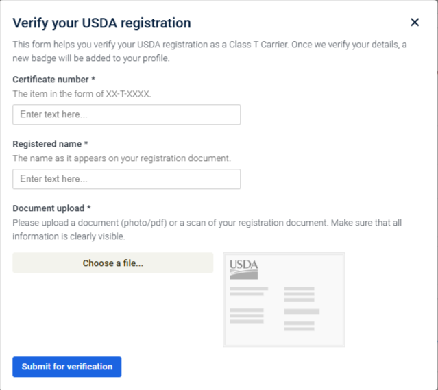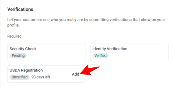 This verification ensures your business remains in good standing and adds a USDA verified badge to your profile. To verify your USDA registration: